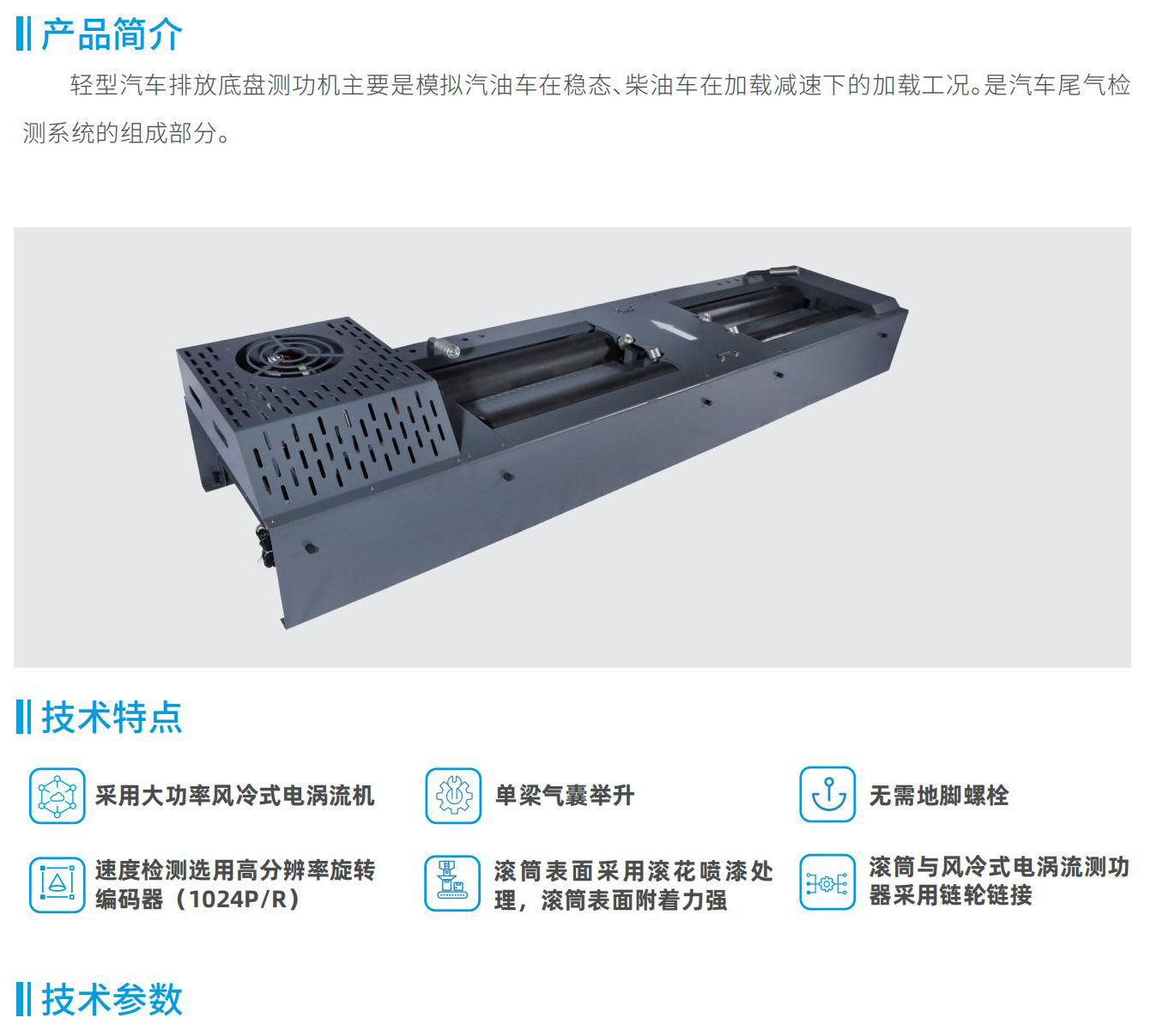 輕型汽車排放底盤測功機主要是模擬汽油車在穩態、柴油車在加載減速下的加載工況。是汽車尾氣檢測系統的組成部分。