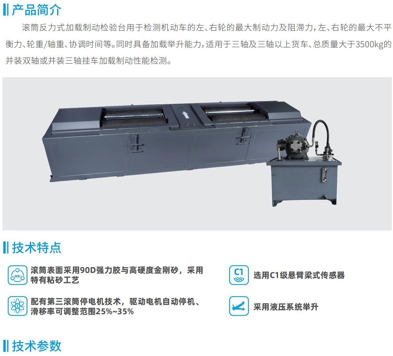 滾筒反力式加載制動檢驗臺用于檢測機動車的左、右輪的最大制動力及阻滯力,左、右輪的最大不平衡力、輪重/軸重、協調時間等。同時具備加載舉升能力,適用于三軸及三軸以上貨車、總質量大于3500kg的并裝雙軸或并裝三軸掛車加載制動性能檢測。