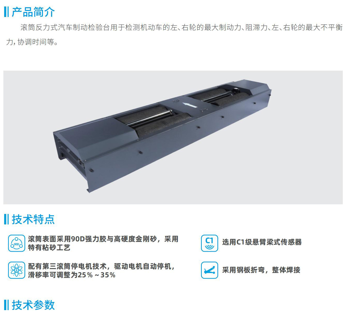 滾筒反力式汽車制動檢驗臺用于檢測機動車的左、右輪的最大制動力、阻滯力、左、右輪的最大不平衡力,協調時間等。