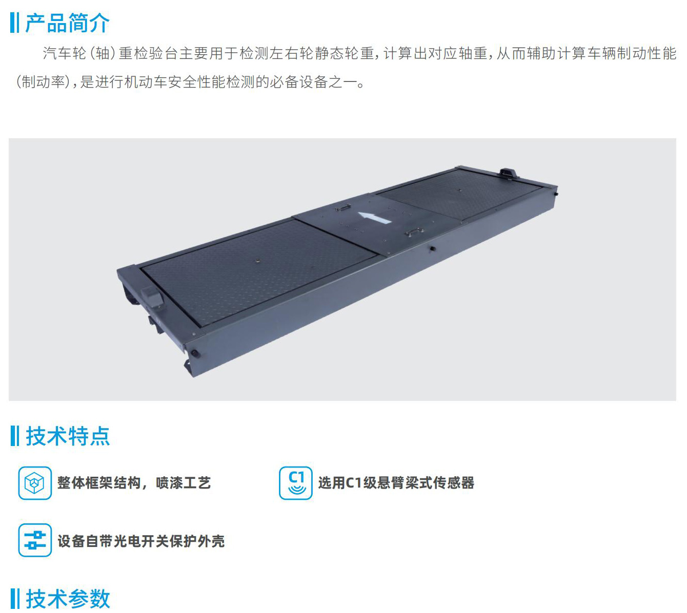 汽車輪(軸)重檢驗臺主要用于檢測左右輪靜態輪重,計算出對應軸重,從而輔助計算車輛制動性能(制動率),是進行機動車安全性能檢測的必備設備之一。